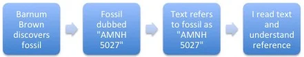 My argument depended on the causal theory of reference normally attributed to Saul Kripke (1980). According to that theory, the correct use of a name derives from a causal connection between the speaker's use of the name and the name's original coinage. As an example, consider my assertion that Barnum Brown discovered my favorite fossil, AMNH 5027. A partial sequence of events could be rendered as follows: