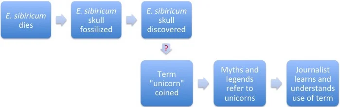 The question mark indicates an ambiguous connection: the journalist's understanding of the term "unicorn" might or might not be part of the sequence of events that began with the death of an E. sibiricum. Since the two events might be connected by correlation rather than by causation, the journalist's use of the term must be incorrect and her claim is therefore false.
