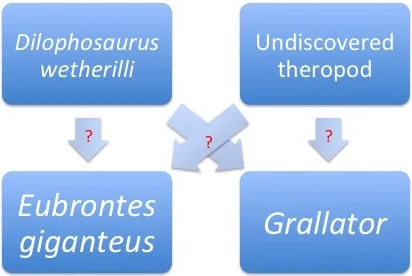 He cites (among others) four reasons for the paleontologist's obligatory disinterest in connecting traces fossils with the animals that made them: first, one organism may produce multiple different kinds of trace; second, the same trace may be preserved differently in different substrates; third, different organisms may produce identical traces; fourth, the body fossils of a trace maker might not be preserved themselves (pp. 155-161). To reiterate an example from my last post: the state fossil of Connecticut, Eubrontes giganteus, is a kind of fossil track commonly attributed to a theropod dinosaur "similar to" Dilophosaurus wetherilli, but D. wetherilli itself is a candidate for the tracemaker. Furthermore, either of those theropods might also be responsible for a similar kind of fossil track, Grallator. We can visualize the whole mishegoss as follows: