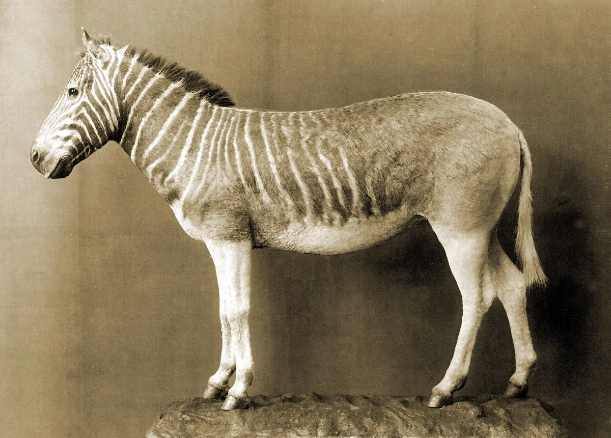 Quaggas were a subspecies of zebra endemic to South Africa that went extinct in 1883 when the last captive quagga died in an Amsterdam zoo. Quaggas looked a lot like zebras, with typical zebra stripes on their head and neck. Below the neck, however, the stripes fade into a reddish brown body. In the decades leading up to the quagga’s extinction, South Africa was seen as a “hunter’s paradise,” where Europeans would settle or travel to in order to enjoy hunting expeditions. Hunters sold quagga meat as food and hides as leather, and colonial governments aimed to eradicate the species for fear that it would compete with livestock. As a result, colonists quickly hunted the species to extinction (Rau 1974).