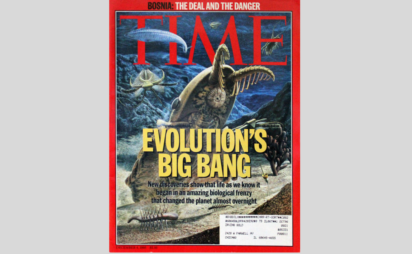 Anomalocaris reared up, mouth open, its spiny arms outstretched to their furthest limit. It was preparing to fall on a diminutive “lace crab” (Marrella splendens), which was paddling like hell to get away. In front of Marrella were plastered the words “Evolution’s Big Bang” in giant, boldface letters. It was all taking place on the cover of TIME magazine (December 4, 1995), whose cover story promised to illuminate how “life as we know it appeared in an amazing biological frenzy that changed the planet almost overnight.”